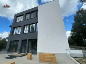 Nowoczesna elewacja budynku szkoły w Kaliszkach. Zastosowaliśmy tu styropian o grubościach od 15 cm do 30 cm. Tynki Majsterpol – kolory mp131 (grafit) oraz mp020